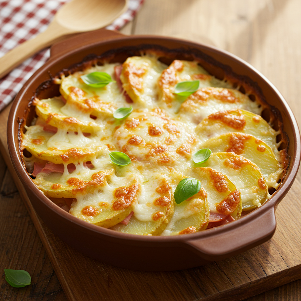 - 2.Slice potatoes thinly and layer in a baking dish.