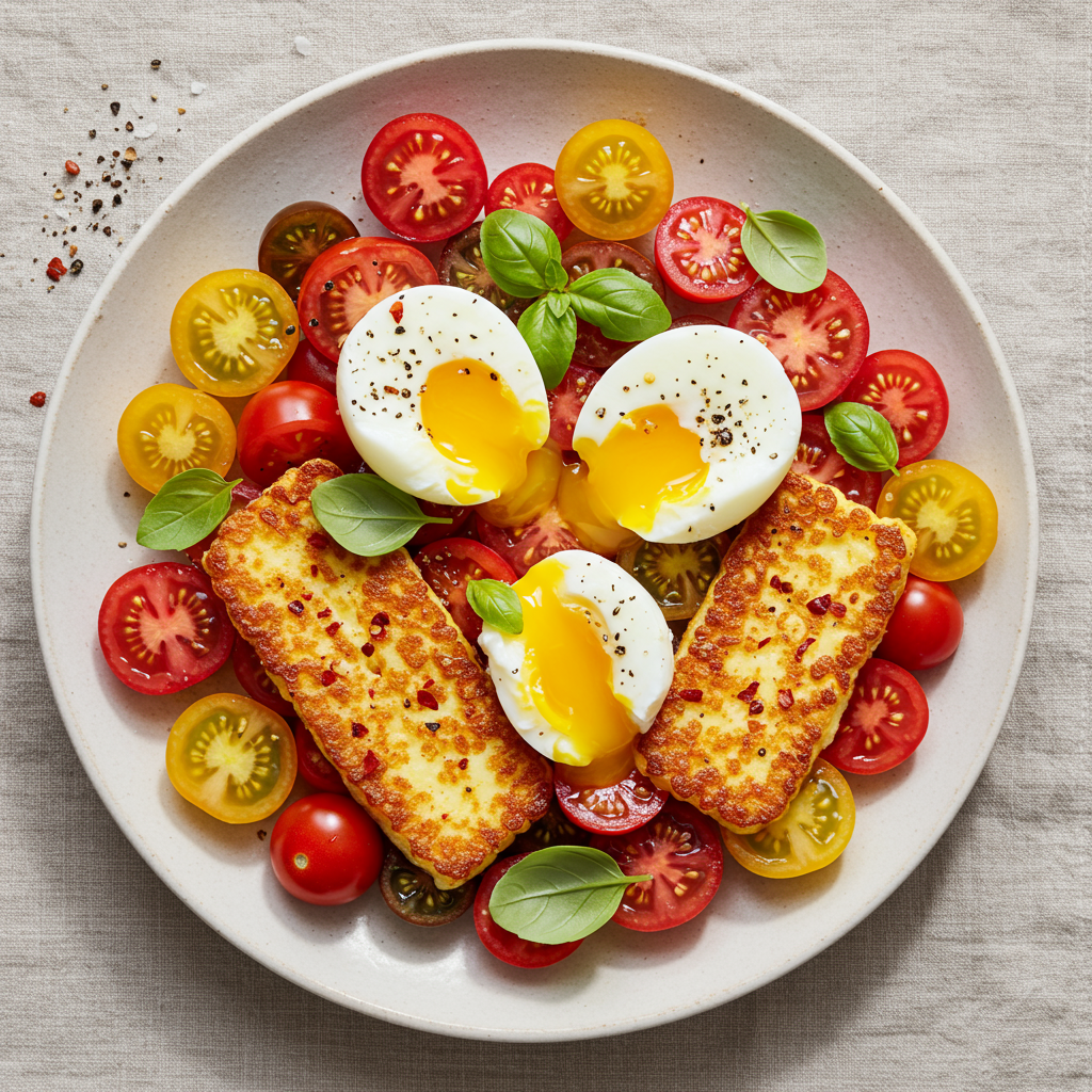 Chilli Haloumi and Tomato Salad with Poached Eggs