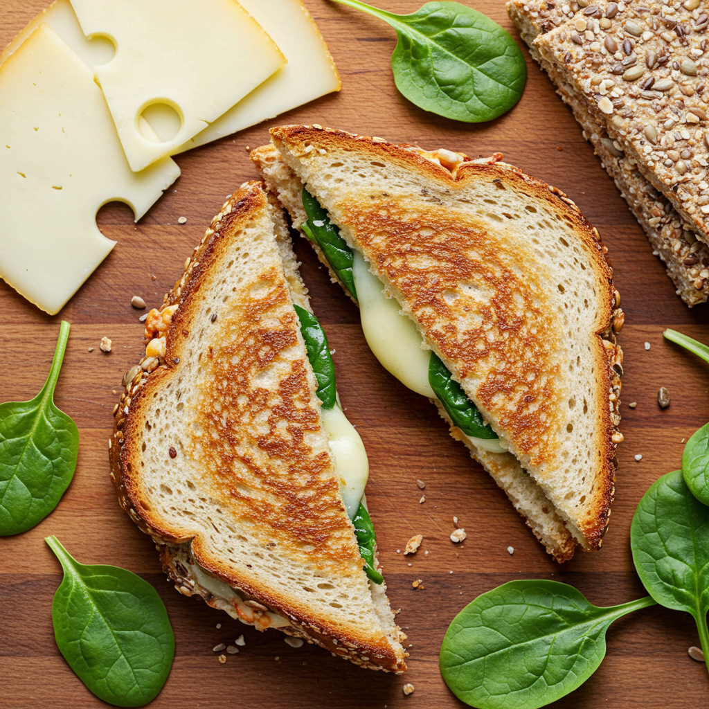- 1.1. Layer 40g of light cheese slices and a handful of fresh baby spinach between two slices of sourdough bread, adding a pinch of salt and pepper to the inside.