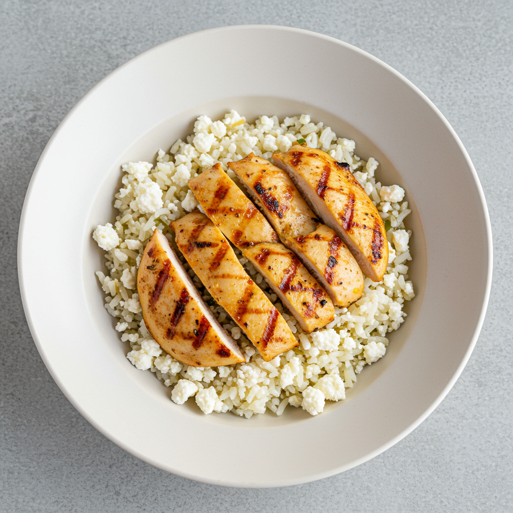 - 6.In a large serving bowl, mix the cooked basmati rice and the sautéed cauliflower rice together; this effectively doubles the volume of your meal. Top the mixture with the golden chicken, the diced vegetables, and the crumbled feta.