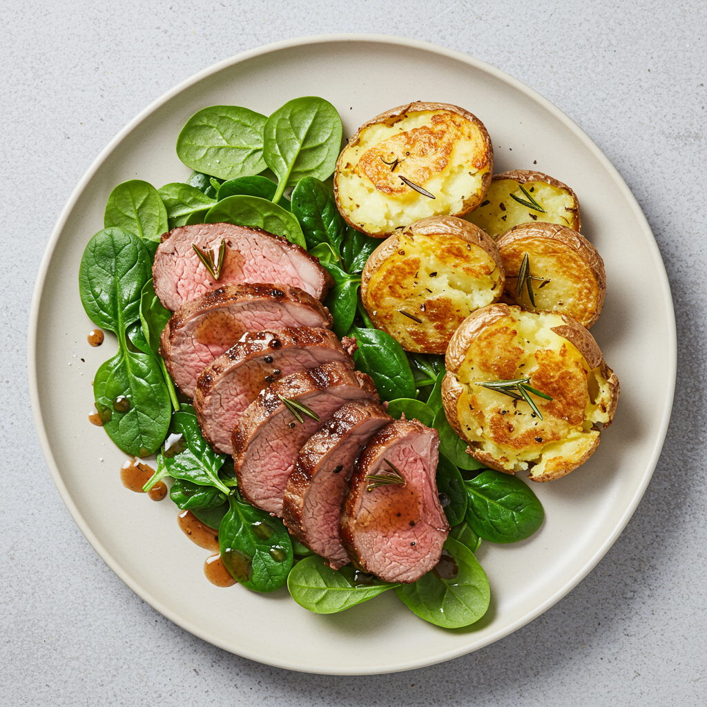 - 5.Serve the sliced lamb over a bed of fresh spinach with the crispy smashed potatoes on the side.