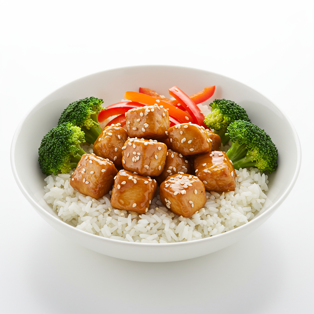 - 6.Assemble the bowl with a base of rice, topped with the sticky chicken and greens.