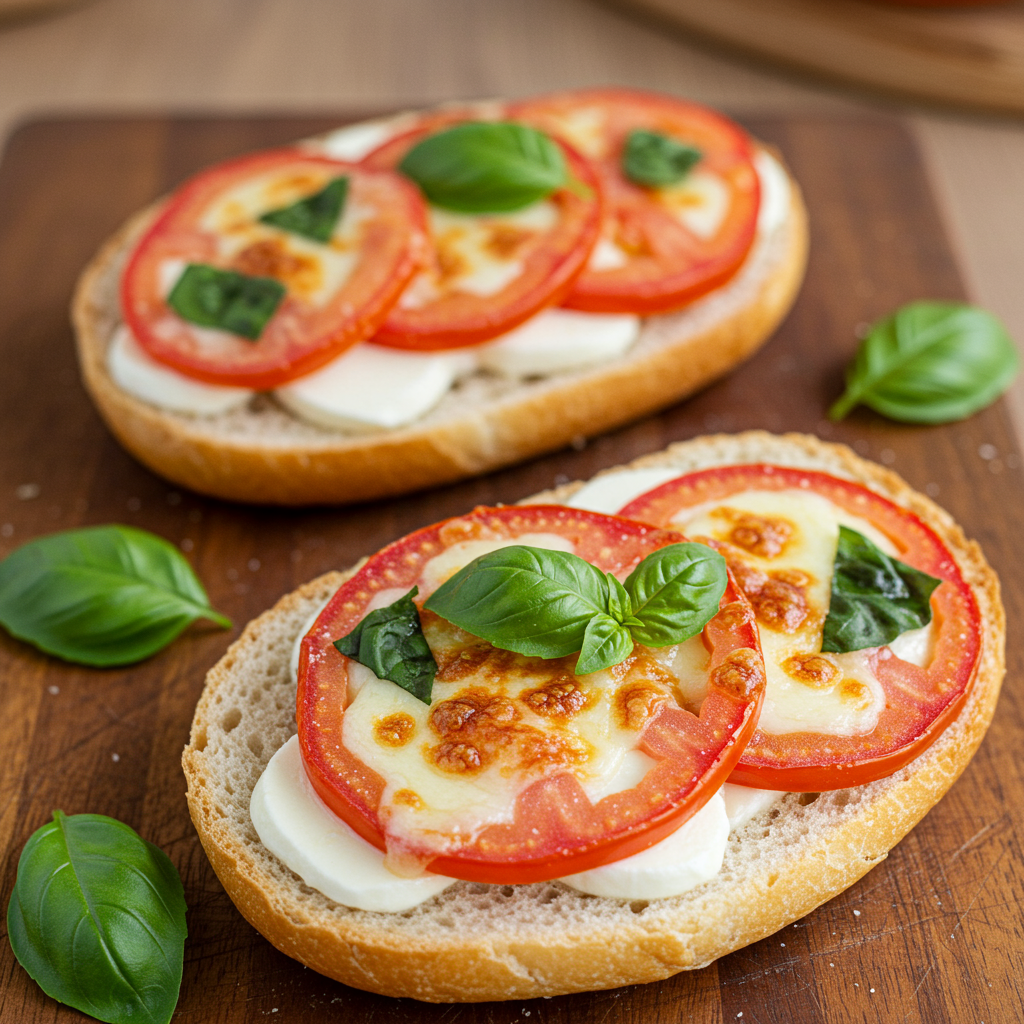 - 3.Spread tomato, basil and grated mozzarella on each half.